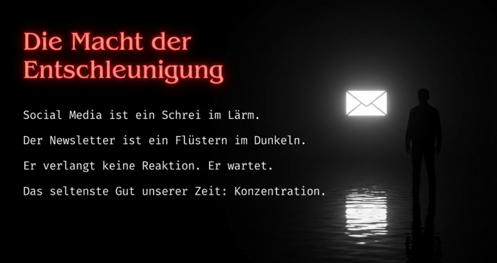 In dieser neuen Dunkelheit wirkt der Newsletter plötzlich wie ein unheimliches Ankerpunkt. Nicht spektakulär, aber von einer beunruhigenden Stabilität. Er ist ein geschlossener Raum, der niemandem gehört außer dem Absender und denen, die ihn eingelassen haben. Kein unsichtbarer Algorithmus entscheidet hier über Licht oder Dunkelheit. Keine fremde Macht diktiert den Ton.