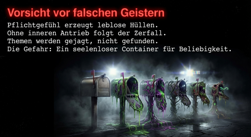 Ohne diesen inneren Antrieb verkommt der Newsletter zu einem seelenlosen Container für Beliebigkeit. Er wird zu digitalem Rauschen, das niemand vermissen würde. Doch mit diesem Funken kann er zu etwas werden, das die Zeit überdauert. Genau hier verläuft die Grenze zwischen dem, was bleibt, und dem, was vom digitalen Abgrund verschlungen wird.